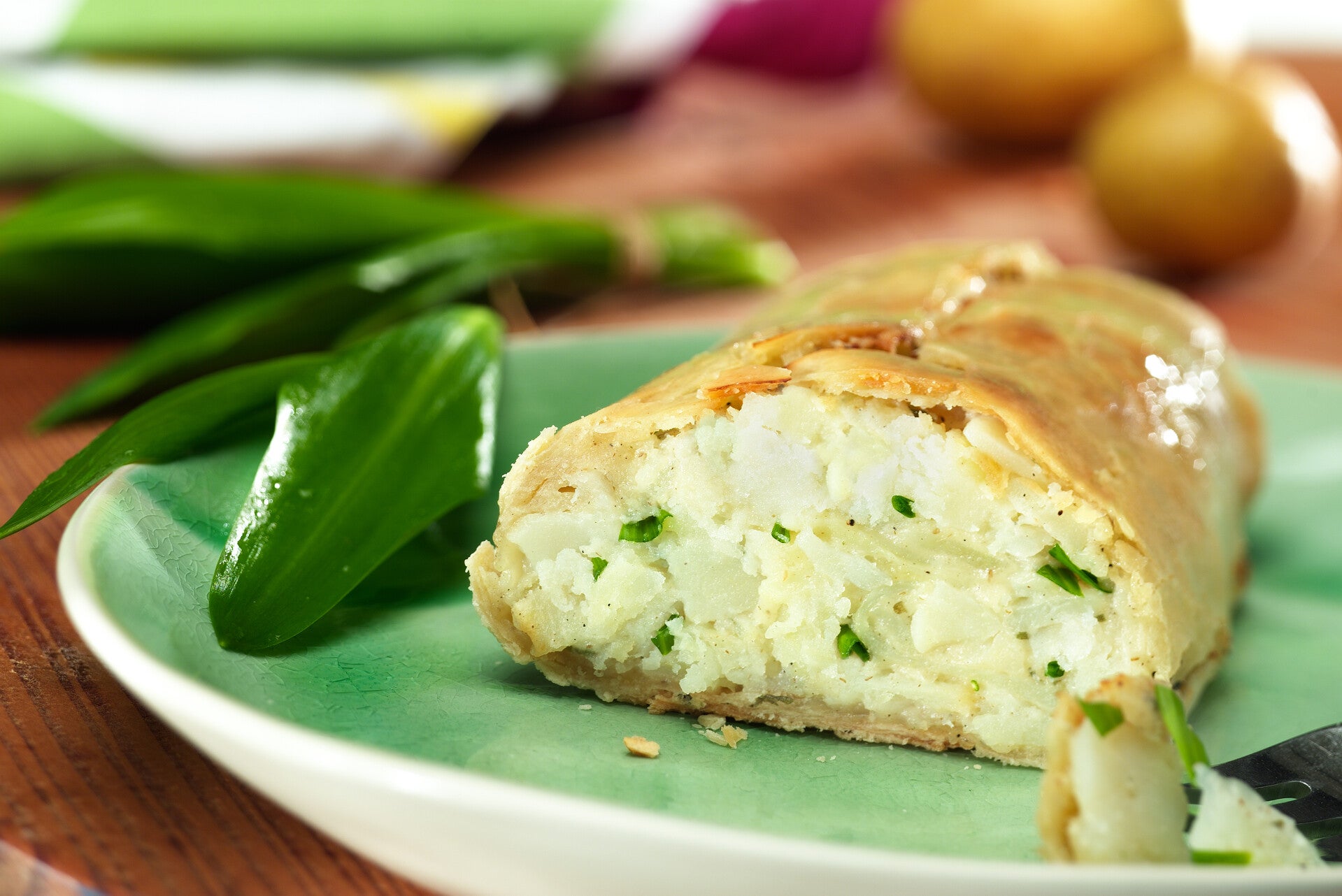 Dünn ausgerollter Strudelziehteig gefüllt mit frischen Kartoffeln, verfeinert mit Bärlauch, Sauerrahm, Gouda Käse und edlen Gewürzen wie Muskat und Kümmel, ungebacken zum Selberschneiden und tiefgefroren.